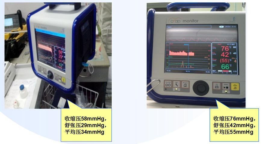 2、关于低血压和休克状态下,CNAP是否能够检测这个问题经常被问及。实际上对于临床医师来说,监测的目的在于治疗,甚至许多临床工作者都认为不以治疗为目的的监测是没有意义的。所以,考验一项医疗设备是否能够在低血压和休克状态下进行监测,我们不能本末倒置:我们需要将更多的关注点放在设备是否能在休克早期和低血压出现时,及时准确做出提示(“未雨绸缪”),并在治疗的过程中通过全局的、连续的、动态的趋势变化图来评估治疗效果。这两点恰恰就是CNAP的创新优势,CNAP能在休克和低血压早期出现的第一时刻就发现“端倪”,并提供整个监测过程中的血压和其他血流动力学参数的连续动态变化趋势,从而评估治疗效果;同时在临床实际跟台中,我们的CNAP能在休克和低血压出现时进行监测,以下为休克病人中实际监测过的图片: